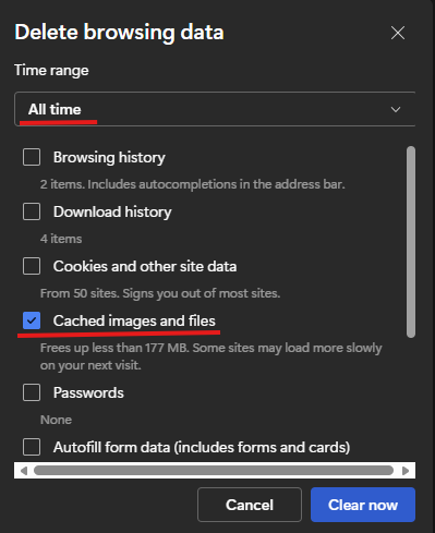 - In the Delete browser data menu, under Time range choose All time and make sure cache is selected.